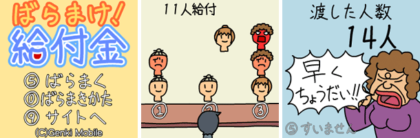 『ばらまけ!給付金』は、プレイヤーが役所の人となり、給付金を受け取りに来た人にひたすらお金を渡すゲームです。受給者の待つ場所に書いてある番号を数字キーで押すことで、給付金を渡すことができます。受給者は次から次へと給付金を求めにやってきて列に並び、待たせると怒り出してゲームオーバーとなるため、素早さと正確さが問われます。