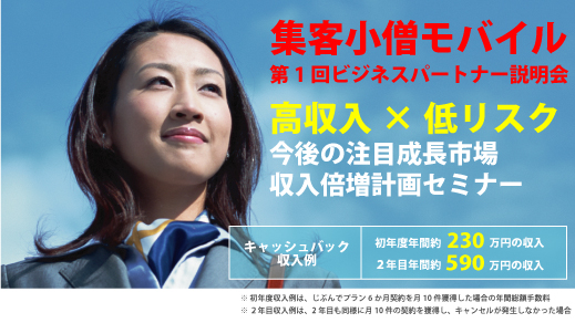 問合せ殺到! 小僧com『集客小僧モバイル』 第1回ビジネスパートナー向け「高収入×低リスク 今後の注目成長市場収入倍増計画」セミナーを開催