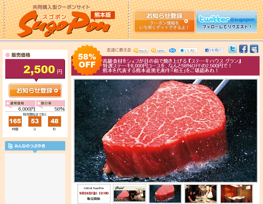 「SugoPon」とは、商品が掲載されてから指定時間内で購入者数が一定数を超えた場合に