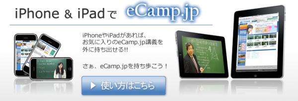 eCampでは全ての映像授業がiPhone、iPadに対応しています。PC(ブロードバンド)での利用と同様に、英数国を中心とした合計1500コンテンツ(1授業約50分)が提供されます。これだけの数の学習コンテンツをiPhone、iPad で視聴できるのはeCampだけです。今後はモバイル端末の特性を生かした授業コンテンツも提供予定です。各社スマートフォンでのサービス提供も視野に入れております。iPhone、iPadでの利用方法を確認したい方はeCamp.jpのTOPページで確認できます。