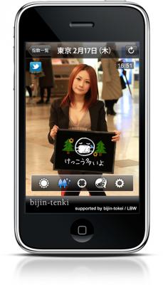 『美人天気iPhoneアプリ版』は、1月17日の公開開始から24時間以内でアップルジャパン株式会社が運営する「App Store」の無料アプリダウンロードランキング総合1位を獲得しました。また、3日で10万ダウンロードを突破、1週間で20万ダウンロードを突破するなど、多くのユーザーにご利用いただいている人気のアプリとなっております。