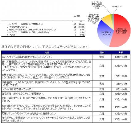 今回の調査結果から、セラピストは、年代を問わず異業種からの転職が多いこと、また、お客様や地域のために役立ちたいという奉仕の精神が高く、開業意欲も高い職種であることがわかりました。