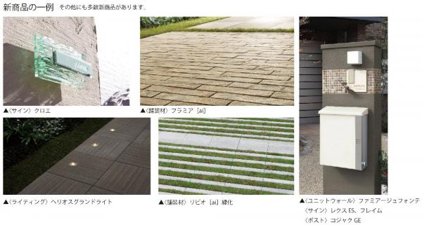 今回の新商品は、住む人のライフスタイルを考えて開発した、照明や蛇口などが付いた機能門柱〔ファミアージュシリーズ〕、石畳の表情をもったボーダー形状の舗装材〔フラミア〕、芝の生育に適した形状で高い緑化率を実現する緑化舗装材〔リビオ緑化〕、化粧ブロックに合わせやすい16cm幅のボーダー〔ファインボーダー〕、ソーラー充電できるLEDライト〔ヘリオスグランドライト〕など、多彩なラインナップになっています。