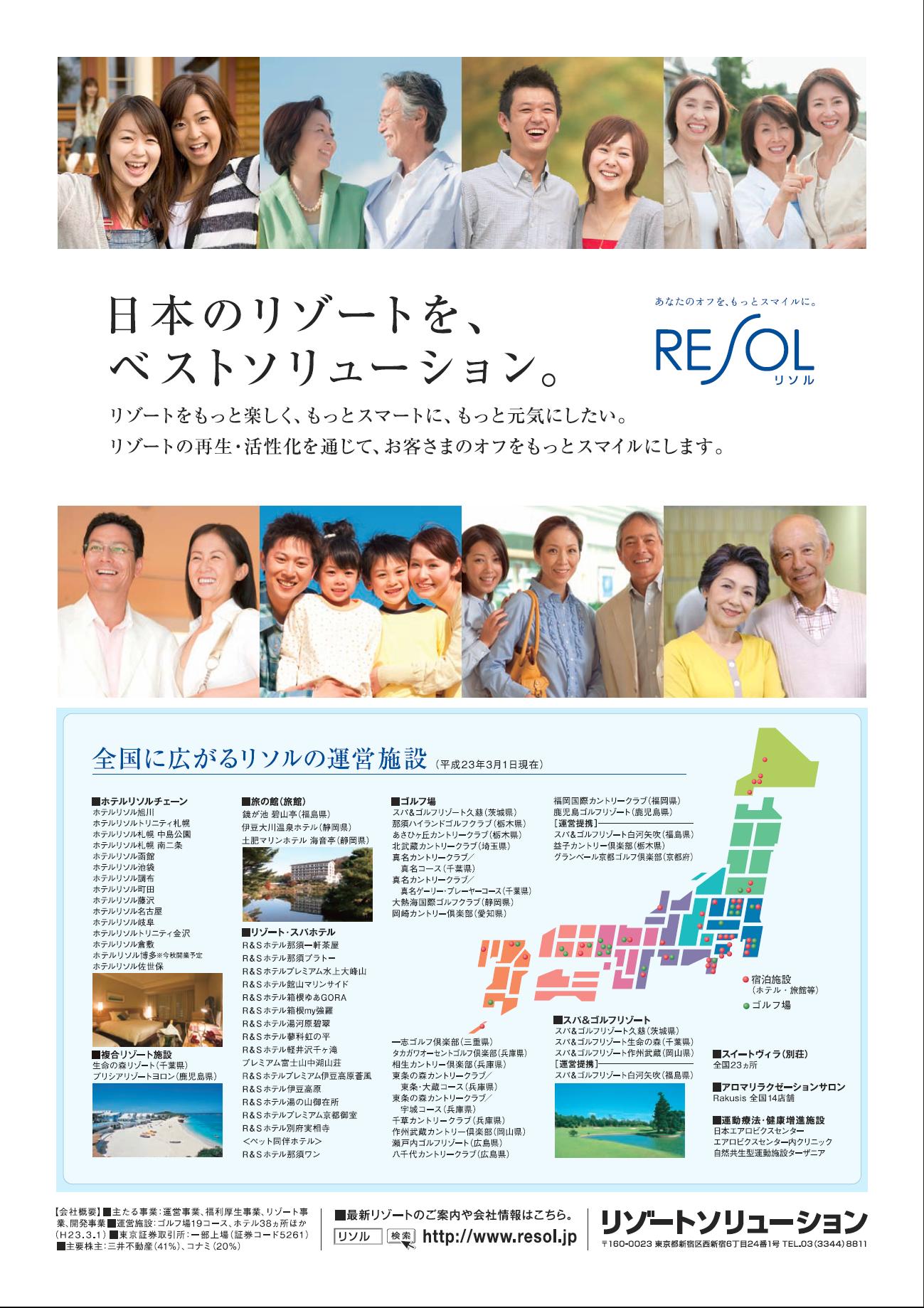ホテルや旅館、ゴルフ場などの運営から企業や団体の福利厚生代行サービスまでを手掛けるリゾートソリューション株式会社(略称:リソル、東京都新宿区、平田秀明社長)は、東北地方太平洋沖地震で被災された福利厚生代行サービス「ライフサポート倶楽部」会員を対象に、全国で展開するホテルや旅館などの直営施設を一時避難先として提供することといたしました。