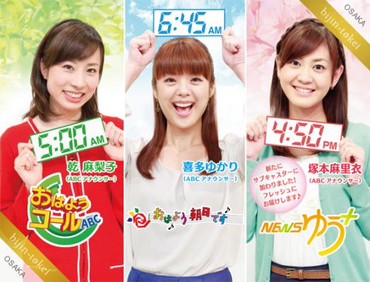 美人時計大阪版をマウスオーバーすると、「おはようコールABC」(月~金 午前5:00~OA)、「おはよう朝日です」(月~金 午前6:45~OA)、「NEWSゆう+」(月~金 午後4:50~OA)のそれぞれの番組に出演する女性アナウンサーがOAスタート時間を手に持って登場します。