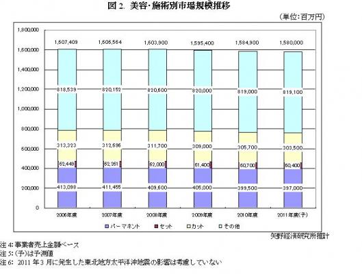 2010年度の理美容市場規模は、前年度比99.1%の2兆2,759億円であった。このうち、理容市場が6,910億円(同98.6%)、美容市場が1兆5,849億円(同99.3%)である。理容市場については、男性若年層の理容室離れや経営者の高齢化に伴う施設数の減少、顧客の高齢化による来店サイクルの長期化、低価格カットチェーンの台頭などから縮小傾向にある。また、厚生労働省の調査によれば美容室の軒数は増加傾向にあるものの、節約志向の高まりによる来店サイクルの長期化や客単価の下落などを背景に、美容市場規模も微減傾向にある。