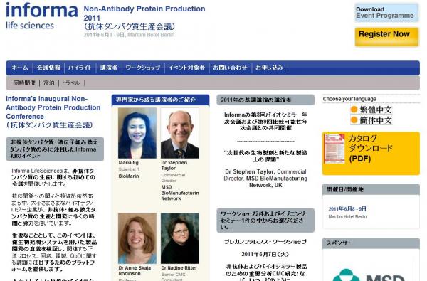 株式会社グローバル インフォメーションでは、皆様の利便性を図る為に、日本語、韓国語、中国語で「Non-Antibody Protein Production 2011(抗体タンパク質生産会議)」の情報を提供するとともに、会議の参加のお申し込みを承っております。