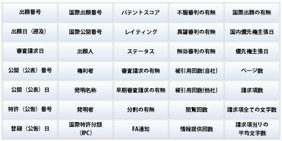 パテントスコア ダウンロード機能をご利用になると、下記のデータが入手できます。