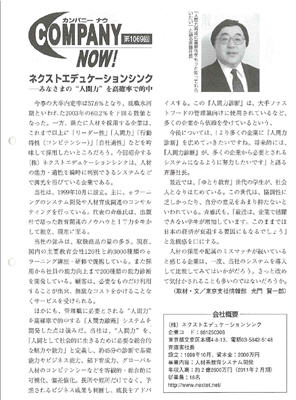 株式会社ネクストエデュケーションシンクは、帝国バンクデータ社が発行する『日刊帝国ニュース』(2011年3月31日発行)の特集「COMPANY NOW!」(1069回)に、「人間力診断(TM)」の記事が掲載されたことを報告しました。
