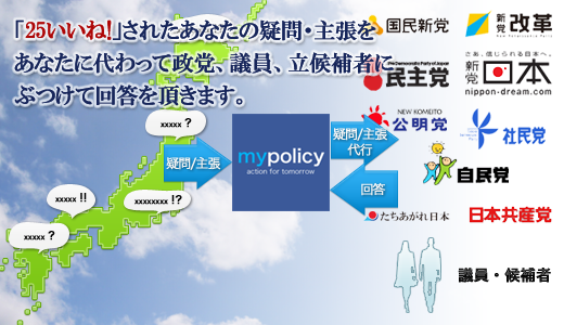 政治家にmypolicyの概要を説明し、協賛頂いた場合はmypolicyに協賛政治家として登録させていただき、連携を強めて参ります。これにより、国民の疑問・不安の早期の解消、政策への民意の早期の盛り込みを目指します。