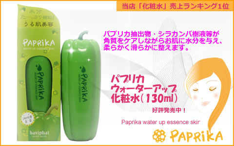 パプリカウォーターアップ化粧水は肌の水分値を高めるエッセンスイン化粧水。外部刺激により、荒れた肌を潤い肌に導き、パプリカの抽出物(トウガラシ葉実エキス)が肌の保護とハリを供給し、シラカンバ樹液が水分と必要な栄養分を補給してくれる植物系の化粧水。