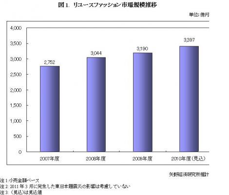 2009年度のリユースファッション市場規模は、前年度比104.8%の3,190億円と推計した。2010年度は同106.5%の3,397億円の見込みである。「良いものを安く買いたい」という意識の高まりや節約志向のほかに、「エシカル消費(倫理的な消費)」というキーワードに象徴されるような購買意識の変化、消費者が入りやすい店舗作りなどを背景に、消費者の中古品に対する抵抗感が薄れつつあるといわれる。