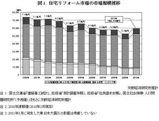 2010年の住宅リフォーム市場規模は前年比約13.0%増の5兆9,439億円(速報値)と推計する。2009年はその前年のリーマンショックの影響を受けて、リフォーム工事実施が非常に冷え込んだ。2010年はその反動に加え、景気回復感が市場に好影響を与え、手控え層を中心に需要が顕在化し、リフォーム市場が大きく回復した。