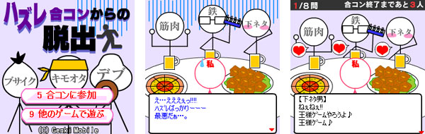 『ハズレ合コンからの脱出』は、つまらない合コンを早く終わらせるために、相手に嫌われる態度をとっていく脱出ゲームです。