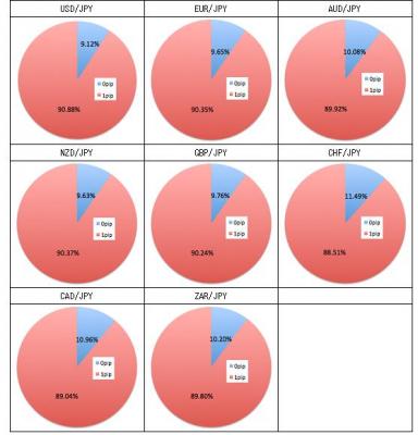 先週(2011/04/04~2011/04/08)のスプレッド実績値は全通貨ペア全時間帯で1銭以下での配信となっており、時間帯によっては(全体の10%前後)ゼロ銭(売値と買値が同じ値段)で提示しています。
