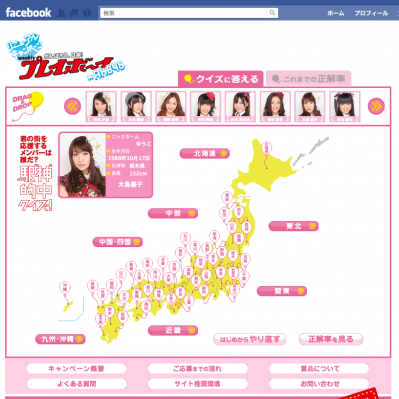 Facebookの週刊プレイボーイページでは、日本初のAKB48アプリを開設。「駅“神”的中クイズ」に直感的な操作で楽しみながらクイズに参加できる仕組みを構築しました。同様の楽しみ方を、週刊プレイボーイ公式サイト「週プレNEWS」のキャンペーンページでも味わうことができます。