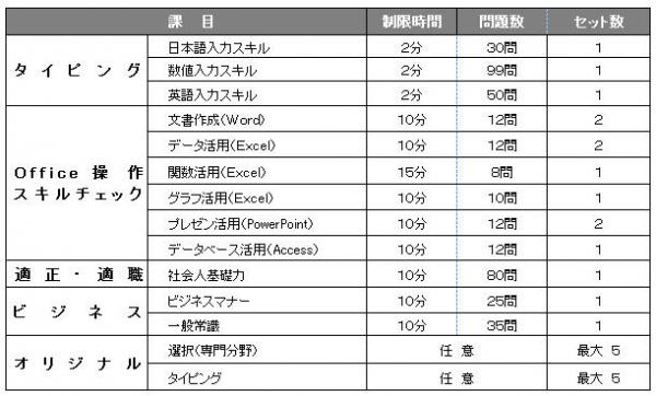 パソコンの基本的な入力スキルを、(1)「日本語入力スキル」と(2)「数値入力スキル」(3)「英語入力スキル」のテストで診断します。測定時間は各2分間。その間に入力された文字数(英文はワード数)と正確性でスキルレベルを診断します。また、問題文の変更はオプション機能にて可能です。