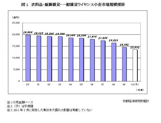 本調査におけるライセンスブランドとは海外ブランド及び国内ブランドとのライセンス(商標使用)契約によって製造販売が行われているファッションブランドを指し、それらのブランドにおける衣料品、服飾雑貨品、一般雑貨品の市場のことを表す。但し、アニメ等のキャラクターブランドは含まれない。またマスターライセンシーとはそれらのブランドの日本市場における窓口企業を指し、サブライセンシーとはマスターライセンシーとの契約で実際に商品の製造販売を行なっている企業を指す。