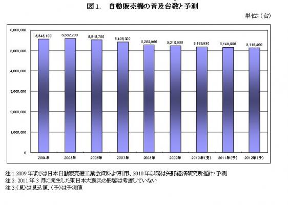 2010年の自動販売機(以下自販機)の普及台数は、前年比99.4%の518万6,950台の見込みである。同市場規模は、2006年以降減少傾向にあり、今後も減少傾向が続く見通しである。