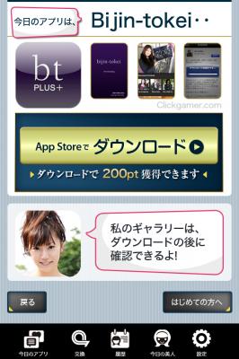 アプリを起動させると、お勧めアプリを表示したボードを持った女性(以下:「美人」)の写真画面が立ち上がり、ボードに表示されたお勧めアプリをクリックするとダウンロード画面に切り替わります。
