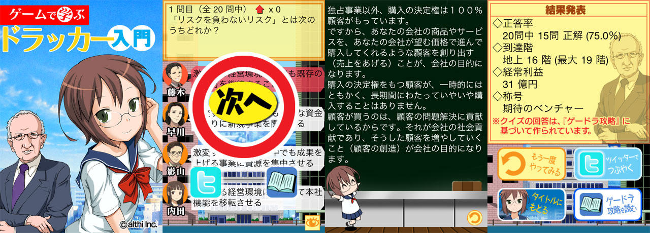 『ゲームで学ぶドラッカー入門』は、ドラッカー理論を用いたビジネスコンサルティングの第一人者として活躍されている「藤屋伸二」氏とアルティが共同で開発したiOSアプリです。クイズ感覚でドラッカーとマネジメントに関する知識を学べる入門者向けのゲームアプリとしてApp Storeにて配信しており、多くの皆様にご利用いただきましたおかげで、App Storeの「ゲーム-教育」カテゴリ有料アプリランキングで1位を記録することができました(2011年3月)。