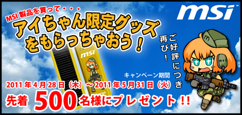 期間中に、リンクスインターナショナルの代理店シールが貼られたMSI製品を購入すると、MSI(ミリタリー少女アイちゃん)の限定iChargeを先着500名様にプレゼントします。なくなり次第終了とさせていただきます。