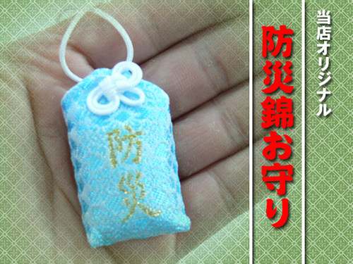 錦お守り袋小のオリジナルグッズとして、表面に「防災」の文字を織り込んだ防災錦お守り袋小を新発売。裏面にオリジナルの名入れが可能です。東日本大震災で安心・安全を願う気持ちを込めて製作しました。