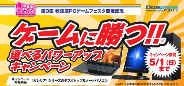 全国23店舗及びウェブ通販のパソコンショップ『ドスパラ』を運営する株式会社サードウェーブ(代表取締役 : 尾崎健介、本社 : 東京都千代田区)は、2011年4月26日(火)より、ドスパラ通販サイトにて、秋葉原PCゲームフェスタの開催を記念し、「ゲームに勝つ!!※ 選べるパワーアップキャンペーン」を開始いたしました。