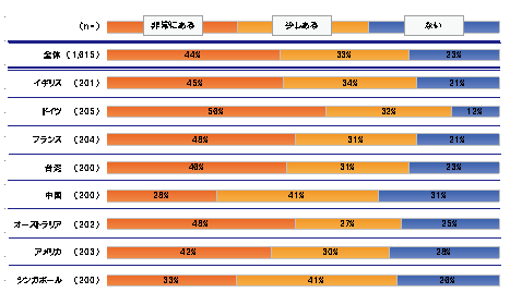 l 特に欧州は3か国すべて「非常にある」が全体平均(43%)より高く、「少しある」という回答より多い。