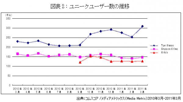 このように大手LCCがシェアを競っているシンガポールでは、LCCの成長が著しく、ユーザーの関心度も高まっています。世界的にそのブランドイメージの高さで知られているシンガポール航空(Singapore Airlines)と、同国を拠点とするタイガー・エアウェイズのユニークユーザー数の推移を比較すると、シンガポール航空がほぼ同水準で推移している一方で、タイガー・エアウェイズは過去半年で約1.5倍増加させています。また、エアアジアも同様にデータの取得が可能となった9月以降、シンガポール航空に迫る勢いで推移しています。(図表2)