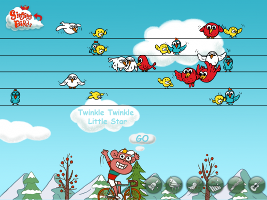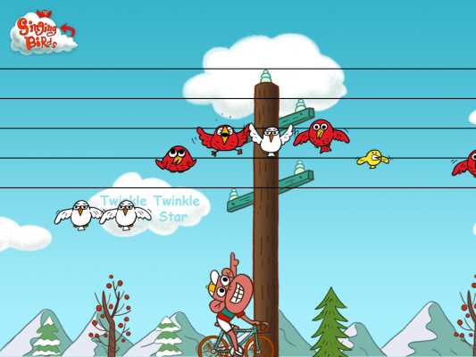 子供たちが、いきなり音符を見て学ぼうとすると挫折することが多いですが、SingingBirds HDの電線に止まる小鳥たちは音符を連想させるので、SingingBirds HDで遊んでいると子供たちがはじめて音符を学ぶときでも、音符に抵抗感なく、とてもスムーズに覚えることができます。