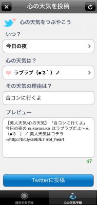 上記2点を選択し、心の天気の理由を入力して「Twitter(R)に投稿」ボタンを押すと、あなたの心を天気予報風にアレンジしたつぶやきがTwitter(R)に投稿されます。この心の天気予報機能でさりげなくそして楽しく、自分の気持ちをフォロワーに伝えることが可能になりました。