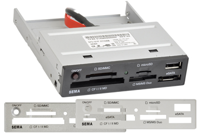 型番はSFD-321F/T71UJR-3BEZEL。サイズは101.6(幅)×122(奥行)×25.4(高さ)mm。重量は192g。接続はマザーボードのUSBヘッダーピンとSATA コネクタ接続。搭載スロットはSD/MMC スロット x 1、microSD スロット×1、CF/MD スロット×1、MS/MS Duo スロット×1、USB 2.0/1.1コネクタ× 1、eSATAコネクタ× 1です。3色ベゼルを同梱しています。カラーはスーパーホワイト、シルバー、ブラック(本体に付属)です。