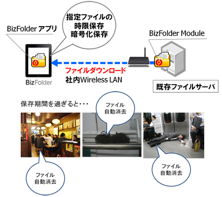 BizFolderは、社内のファイルをiPadに暗号化時限保存を行うため、安全に社内ファイルをiPadにて外出先に持ち出すことが可能です。(特許出願中)