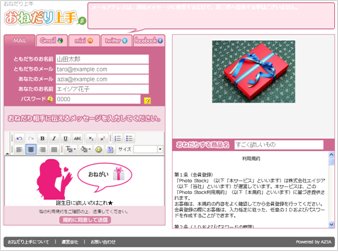 新サービス「おねだり上手」は、ECサイト訪問者が、欲しい商品を恋人・友人・家族・親戚等に気軽に“おねだり”できる機能を提供するクラウドサービスです。本機能を実装したECサイトでは、ユーザーは商品ページにある「おねだりボタン」を押すと、メール・Gmailのほか、twitter・Facebook・mixi等のソーシャルメディア経由で簡単に“おねだり”することができます。