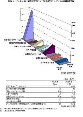 2010年度のビジネス分野向けライブ映像配信サービス市場規模は6.4億円を見込む。2020年度には7,442億円となり、業務分野別では「広告・宣伝・プロモーション」が4,640億円と全体の約62%を占めると予測する。