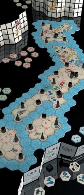 ごとに分けられたゲームボード4枚を合わせると、日本列島が再現されます。ゲームで勝利するためには、その町や村に及ぼす力が1番になるように自分のトークンを配置して、力の源となるコマを取っていきます。