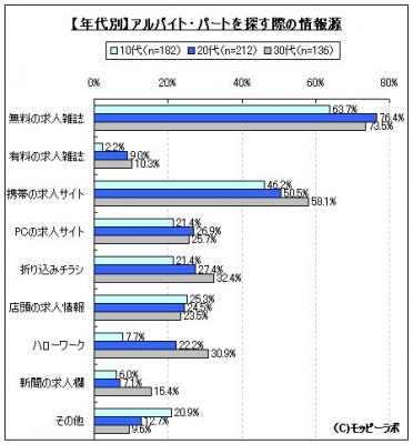 過去1年間にアルバイト・パートを探した経験がある人に対して「利用した情報源」についてモバイルリサーチで聞いたところ、トップは「無料の求人雑誌」(71.3%)、次いで「携帯の求人サイト」(50.9%)、「折り込みチラシ」(26.6%)という結果となった。年代別で比較したところ、「ハローワーク」の利用については、10代と30代では20ポイント以上の大差が生じていた。また、インターネットが普及している時代に生まれた10代でも「携帯の求人サイト」「PCの求人サイト」よりも「無料の求人雑誌」の利用率が高く、アルバイト・パート探しの情報源としてフリーペーパーなどの「無料の求人雑誌」が幅広く定着していることがわかった。