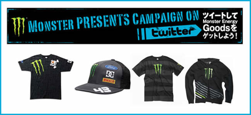 株式会社リンクスインターナショナル (本社:東京都千代田区、代表取締役:川島義之)は、USA支社Links International USA Ltd.(所在地:カリフォルニア州オレンジ郡ニューポートビーチ)の事業であるモンスターエナジーのオフィシャルグッズ専門のオンラインストア「MONSTER ENERGY.JP」にて2011年5月18日(水)~2011年5月31日(火)の期間中、Twitterを利用したプレゼントキャンペーンを開催します。