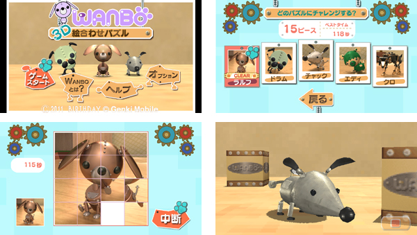 『(3D)WANBO絵合わせパズル』は、バラバラになったピースをスライドさせ、キャラクター「WANBO」の絵を完成させるゲームです。絵を完成させると、3Dの奥行きを活かし、思いっきり動く「WANBO」の3D動画を見ることができます。