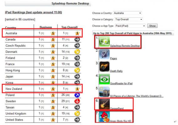 Splashtop Inc.(米国カリフォルニア州サンノゼ、CEO:Mark Lee、以下 スプラッシュトップ社)は、5月19日(現地時間)、iPad版のSplashtop(R) Remote Desktopが今週、オーストラリアとニュージーランドでAngry BirdsやGarageBandなどの有力アプリケーションを超え、有料Appsの第1位を獲得したことを発表しました。Splashtop Remote Desktopは2010年9月の提供開始以来、15カ国で有料Appsの1位となり、ビジネスカテゴリーでは40カ国で1位となっています。(ランキングは、App Anniewww.appannie.comによるもので、毎時更新されています)