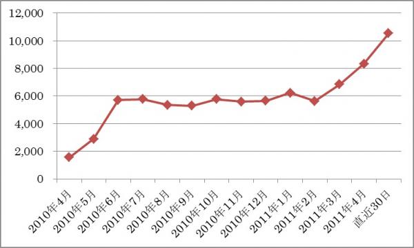 今回「iPad」関連商品の落札動向を調査した結果、2011年3月より再度落札数が上昇しておりました。2011年2月には、