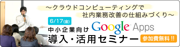 内 容:「中小企業向けGoogle Apps(TM)導入・活用セミナー~クラウドコンピューティングで社内業務改善の仕組みづくり~」