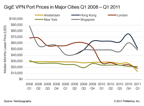香港のギガビットイーサネット(GigE)VPNのポートあたりの月間リース料金の中間価格は、2011年の第1四半期には32%下落して、1ケ月あたり5万1286ドルに、シンガポールでは20%下落して4万8706ドルになった。西欧のVPNポートの価格はアジアよりかなり低いが、それでも下落している。アムステルダムでも、GigE VPNポートの中間価格は、2011年前半に50%急落し、1カ月あたり1万3284ドルになった。