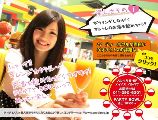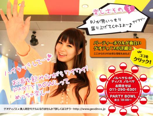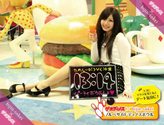 ノルベサ(札幌)6Fのボウリング場「ディノスボウル」にて開催中の、DJなどが会場を大いに盛り上げる「パーティーボウル」(毎週金、土曜日18時~)をメインイベントとした、アミューズメント施設全体のPRとして、「たのし~!パーティーボウルしよ」などのコメント付ボードを持った美人時計モデルが12時12分~15分、12時44分~47分、13時12分~15分、13時44~47分、17時12分~15分、17時44分~47分、18時12分~15分、18時44分~47分に登場します。また、今回は、デート編として「ここにマウスを合わせるとデート気分に!」の表記どおり、実際にマウスオーバーすると、彼女たちとまるでデートをしているかのような気分になれる画像が表示され、パーティーボウルやアミューズメント全体の特徴、楽しさが紹介されます。さらに、同ページ、及びゲオディノスサイトにて7月以降の当PR企画の美人時計北海道版出演モデルを募集します。告知は、施設内の動画でも放映されます。