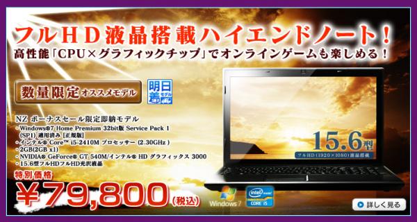 ┗ 話題のフルHDを搭載した「NZシリーズ」から、限定モデルをご用意しました。美しい映像はもちろん、広い視野の表示も実現。さらに、高性能CPUとグラフィックチップによりオンラインゲームまでも楽しめるノートの枠を超えたPCです。7万円台のお値打ち期間をぜひお見逃しなく!