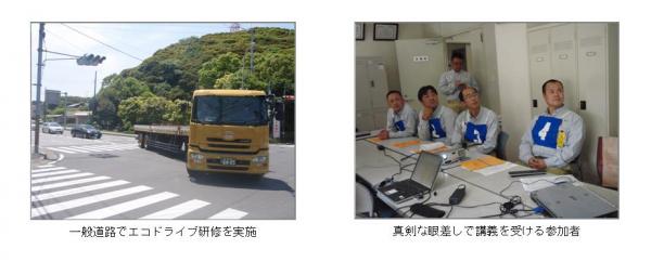 研修は座学と実習の2部構成。座学はエコドライブに関する知識だけでなくトレーラー特有の走行特性も加えて安全にも配慮しました。実習は業務車両に仮の荷物を積載し、一般道約11kmを40分前後で走行するという日常業務と変わらない条件で行いました。