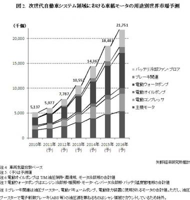 本調査における車載モータとは、スタータやオルタネータ、各種補機類から次世代自動車(HEV/EV)に用いられる主機モータまで、すべてのモータを対象とするが、カーオーディオやナビゲーションシステムに使用されるディスクドライブ・HDD用モータは対象外とする。また市場は車両生産地域をベースとする世界市場とし、対象車両は次世代自動車(ハイブリッド車・電気自動車)を含む、すべての乗用車および車両重量3.5t以下の商用車に搭載される車載モータとした。