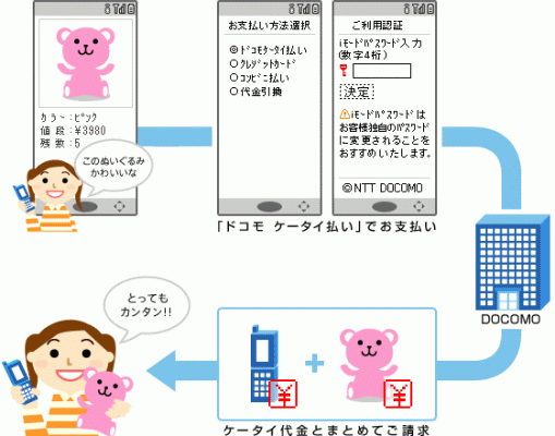 携帯電話でのショッピング代金などを、月々の携帯電話料金と一緒に支払えるサービス。全国約4800万人のiモード利用者が利用出来る。