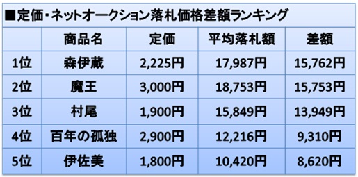 定価と平均落札額(2011年3月~5月)を比較した結果、プレミア焼酎と呼ばれている